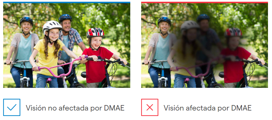 La DMAE es una enfermedad degenerativa de la mácula, zona central de la retina. Provoca la percepción de una mancha negra en la zona central de la visión, que va aumentando progresivamente hasta producir ceguera.