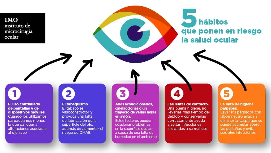 El uso de pantallas y de dispositivos móviles, ya sea por motivos profesionales o lúdicos, puede producir alteraciones en la superficie ocular, especialmente asociados al ojo seco, un trastorno que tiene su origen en la incapacidad de las glándulas lagrimales de segregar lágrima suficiente para mantener el ojo lubricado. “Lo más común es parpadear entre 14 y 18 veces por minuto, pero las personas que trabajan frente a una pantalla, pueden llegar a reducir mucho esta frecuencia, lo que provoca que la superficie del ojo esté mal lubricada”, apunta el Dr. Daniel Elies, del Departamento de Córnea, Catarata y Cirugía Refractiva de IMO, quien recomienda el uso de lágrimas artificiales sin conservantes para evitar la sequedad ocular.
