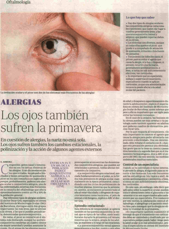 Esta diferencia de temporalidad, se aprecia también en las queratoconjuntivitis: la vernal, que es típica de los niños, suele manifestarse durante la primavera o el verano, mientras que la atópica, propia de los adultos, se mantiene a lo largo de las estaciones. «La queraconjuntivitis vernal aparece generalmente a los dos, cuatro o seis años de edad y desaparece espontáneamente durante la adolescencia», explica el especialista en córnea del IMO, quien subraya que pese a ello es importante que «se vigile para evitar las lesiones corneales». En el caso de la atópica, las lesiones en la córnea pueden ser más severas y «la patología suele también aparecer en adultos que padecen cuadros de dermatitis», indica Óscar Gris. Por lo que respecta al tratamiento, «lo más importante es conocer el agente que causa la alergia para poder afrontarla con precisión y efectividad». Una vez determinado, debe evitarse el contacto con él. «Aunque esta precaución parezca una obviedad, hay gente que no la tiene en cuenta y pasan directamente a la segunda fase que es el tratamiento farmacológico», dice a ABC el experto del IMO. En este sentido, las medidas ambientales resultan esenciales.