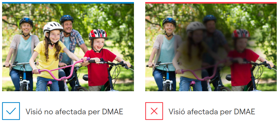 La DMAE és una malaltia degenerativa de la màcula, zona central de la retina. Comporta la percepció d’una taca negra en la zona central de la visió, que va augmentant progressivament fins a produir ceguesa.