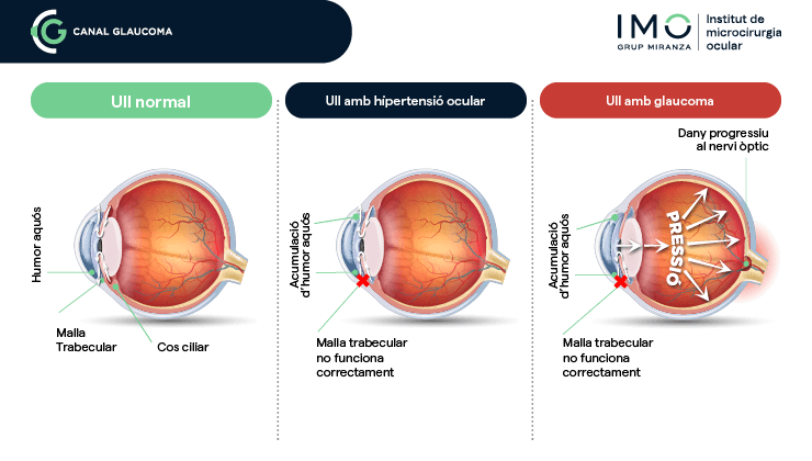 - Ull amb hipertensió ocular. Hi ha un desequilibri en la formació/eliminació de l’humor aquós. Aquest s’acumula dins de l’ull. La pressió intraocular augmenta.