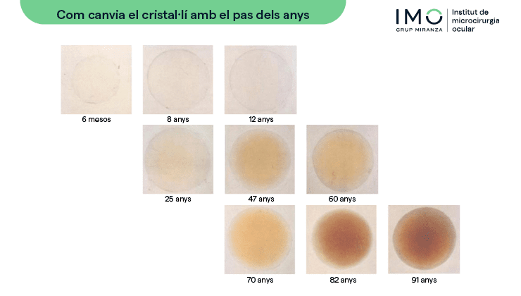 Així mateix, els símptomes associats a aquest problema de visió succeeixen perquè el nostre cristal·lí perd la mobilitat, elasticitat i transparència, i es torna opac amb el pas dels anys, tal com es pot observar en aquesta imatge: