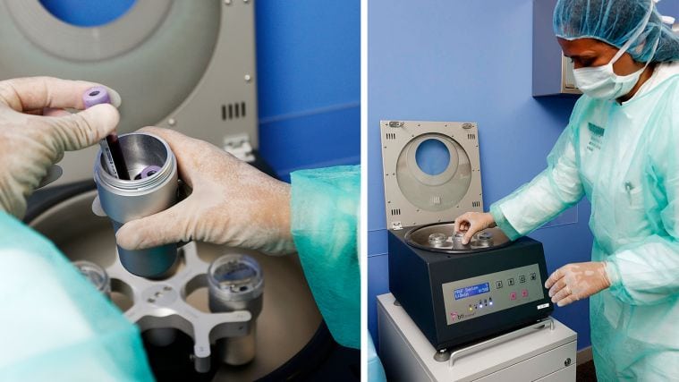 1. La sang del pacient s’introdueix en la centrifugadora per separar els components sanguinis i aïllar el plasma i les plaquetes.