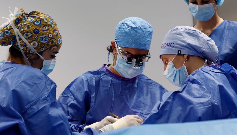 Los doctores Beatriz Ventas y Marco Sales llevando a cabo una blefaroplastia en los quirófanos de IMO Grupo Miranza Madrid.