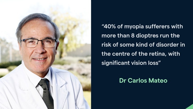 Patients with high myopia, who account for around 2% of the population, are more likely to suffer certain eye diseases such as glaucoma or cataracts and, more particularly, retina-related disorders such as retinal detachment, central retinal degeneration due to atrophic plaques, vessel growth in the macular area below the retina, myopic macular hole or separation of the macular retina layers, known as schisis.