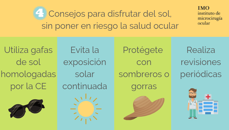 En esta sencilla infografía te mostramos las recomendaciones básicas de nuestros especialistas para evitar los efectos perjudiciales del sol en la salud visual:
