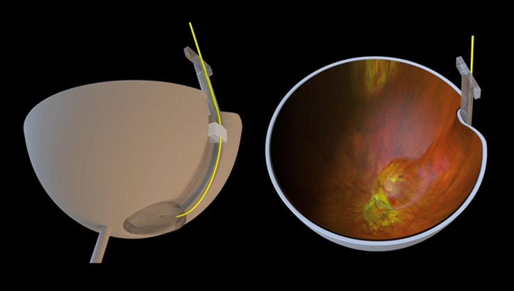 Alrededor del 50% de los altos miopes o miopes magnos (más de 6-8 dioptrías) desarrollarán una deformación ocular conocida como estafiloma, un abombamiento posterior del globo ocular ligado al crecimiento anormal del ojo del alto miope, según advierten los oftalmólogos de IMO. Una de las principales consecuencias de esta lesión es la tracción que ejerce sobre la retina, pudiendo afectar a la zona central (mácula) y conllevar un desprendimiento de retina a causa de un agujero macular. Para estos pacientes, está indicada una técnica llamada indentación macular, reintroducida de forma pionera en España por el Dr. Carlos Mateo, especialista del Departamento de Retina y Vítreo de IMO. La cirugía consiste en insertar un implante (“indentador”) sobre la zona del ojo en la que se encuentra el estafiloma, con el objetivo de ejercer presión sobre la zona deformada y aplicar de nuevo en su sitio la retina desprendida.