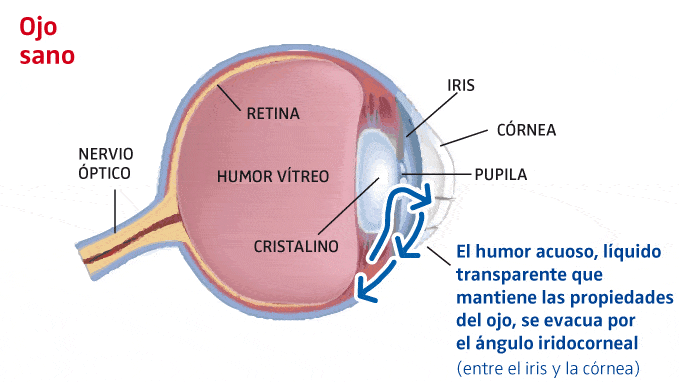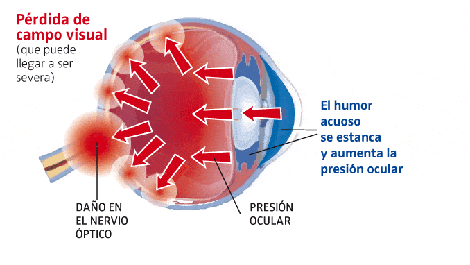 El glaucoma es un grupo de enfermedades que producen un daño progresivo en el nervio óptico. El campo visual periférico va disminuyendo, pudiendo causar ceguera si no se trata a tiempo.